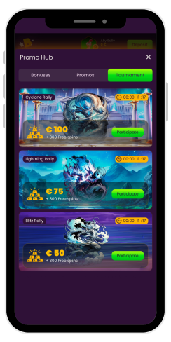 Κατά την προετοιμασία αυτής της αναθεώρησης του online καζίνο Bizzo, βρήκα τρία ενεργά τουρνουά διαθέσιμα για τους παίκτες, προσφέροντας χρηματικά έπαθλα σε μετρητά και δωρεάν περιστροφές. Για να συμμετάσχουν, οι παίκτες έπρεπε να τοποθετήσουν στοιχήματα που κυμαίνονταν από €0,10 έως €2. Το συνολικό ποσό που στοιχηματίστηκε μετατράπηκε σε ειδι κούς πόντους και ο παίκτης προστέθηκε στον πίνακα κατάταξης. Μετά τη λήξη του τουρνουά, το χρηματικό έπαθλο διανεμήθηκε μεταξύ των συμμετεχόντων.